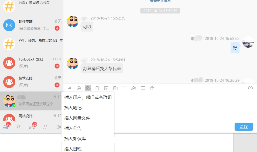 - 多樣化的聊天框,聊天時同時發送附送各種資源:文件、筆記、網盤、公共、知識庫、日程、截屏等。