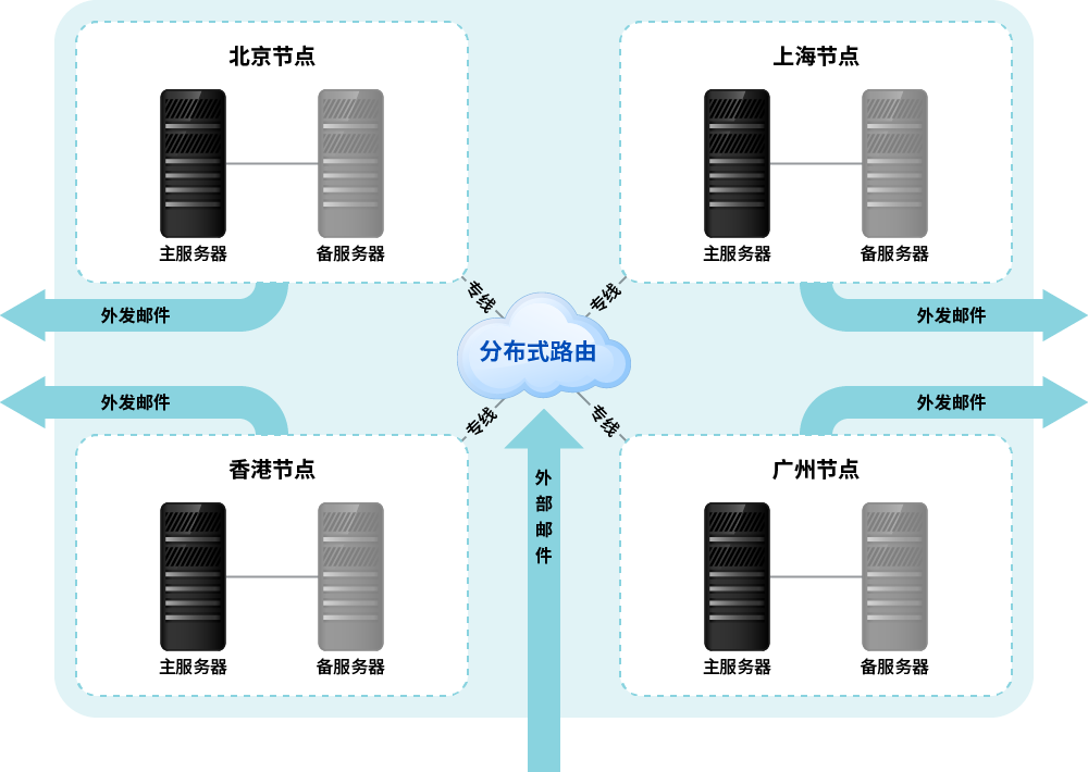 擁有先進的CallBean微服務(wù)軟件架構(gòu)和TurboData存儲設(shè)計的TurboEx分布式郵件系統(tǒng)方案,各郵件服務(wù)器節(jié)點間的數(shù)據(jù)是在全套系統(tǒng)內(nèi)實時同步投遞(更新)的,不是通過定時同步很大的數(shù)據(jù)包,因此大大降低了對異地間網(wǎng)絡(luò)速度的要求,從而完善了異地分布式郵件系統(tǒng)的性能,并且使運維工作變得輕松和簡易。