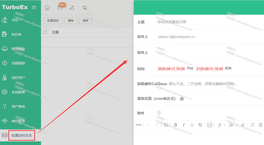 在TurboEx超融合郵件系統中,可以快速的實現自動群發定制郵件的應用,主要做三個工作: