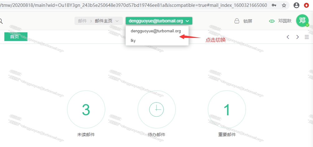 3、舉例:如果設置完成共享郵箱的功能,得到共享權限的人員進入自己的郵箱后,能點擊人員,切換到被共享人的郵箱,使用其功能。