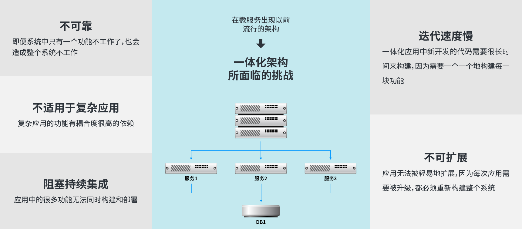企業對內部的辦公系統的需求已由簡單的辦公工具升級為靈活簡單的高效應用,傳統的單體式的軟件架構無法滿足復雜的用戶需求,這里影響了所有的傳統的郵件系統、OA系統、IM系統、視頻會議系統等廠商。單體式軟件架構可以理解為一個單層軟件應用程序,其中用戶界面和數據訪問代碼從單一平臺組合成一個程序,便于實現簡單的功能,但是不能滿足敏捷開發和復雜應用,因為: