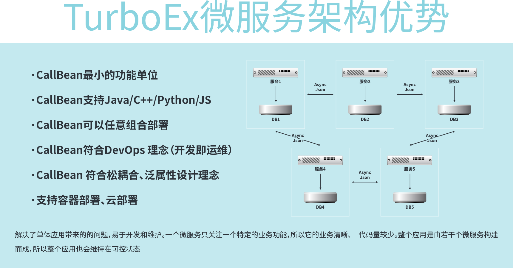 為了實現TurboEx超融合協同辦公平臺的開發目標,拓波軟件改為采用微服務軟件技術研發TurboEx產品,成功研發出CallBean微服務軟件技術,成功應用上線。