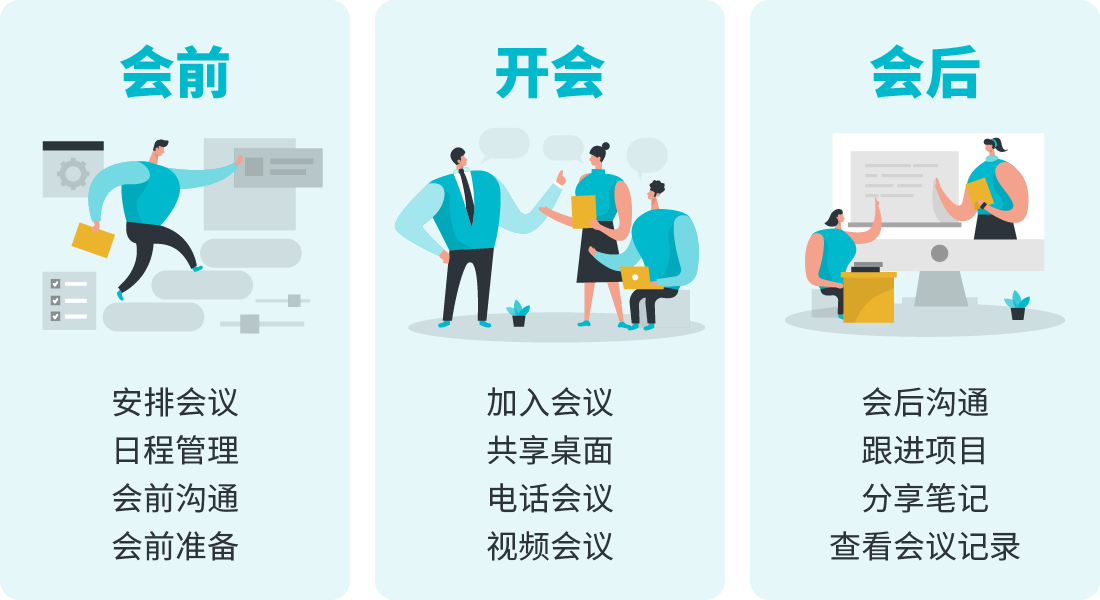參會人通過IM自動收到會議的邀約、會議開始提醒等消息。每場會議,都可以自動生成在線討論群組,成員們可以直接進行溝通。