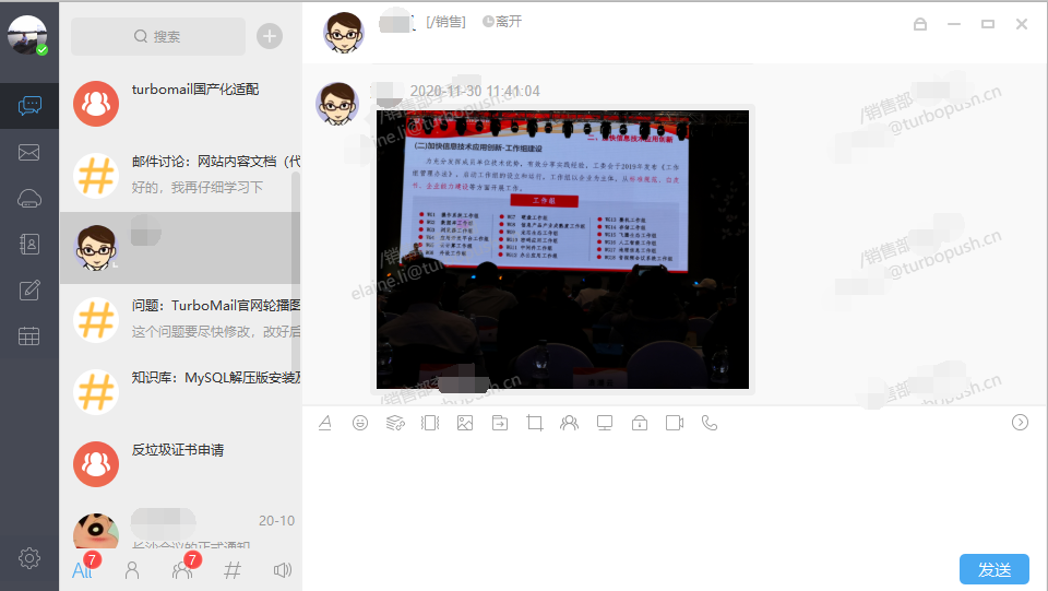 根據郵件賬戶和組織架構自動生成企業內部即時通訊服務,有客戶端軟件和網頁聊天端兩種方式,提供隨時聊天與群組聊天功能,與其他系統功能相互嵌入,在處理不同的工作業務時展開在線溝通討論。