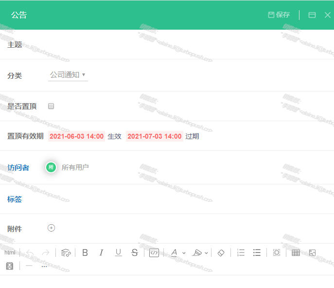 按欄目分類管理企業公告,授權用戶發布公告功能,授權用戶查看公告功能,公告的內容可以攜帶文件附件。