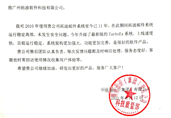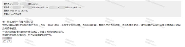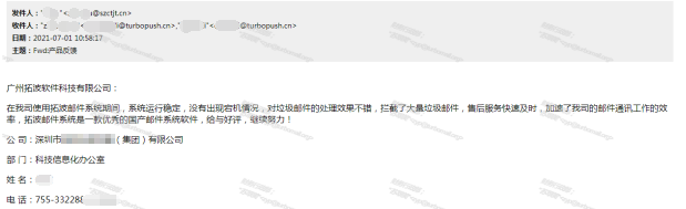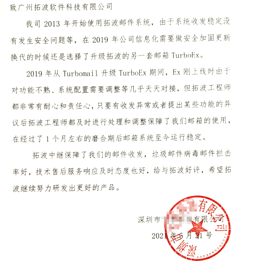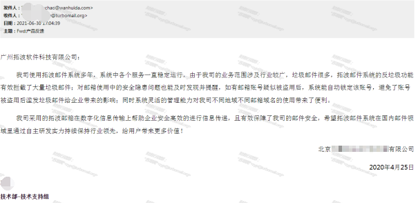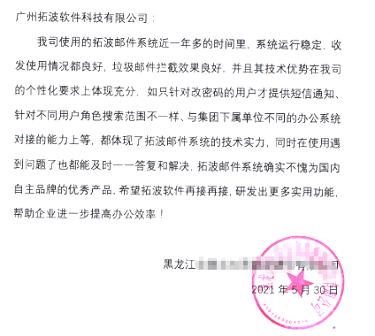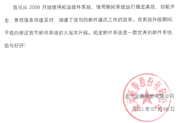 以下是一些客戶發來的好評和感謝信,拓波在此非常感謝客戶的認可與表揚,在拓波未來的發展道路上,將繼續深入研發企業郵件軟件技術,促進產品快速的更新迭代,用持續升級的軟件產品來不斷的回饋用戶,協助企業不斷升級郵件辦公系統,滿足不斷深化的信息化管理需求。