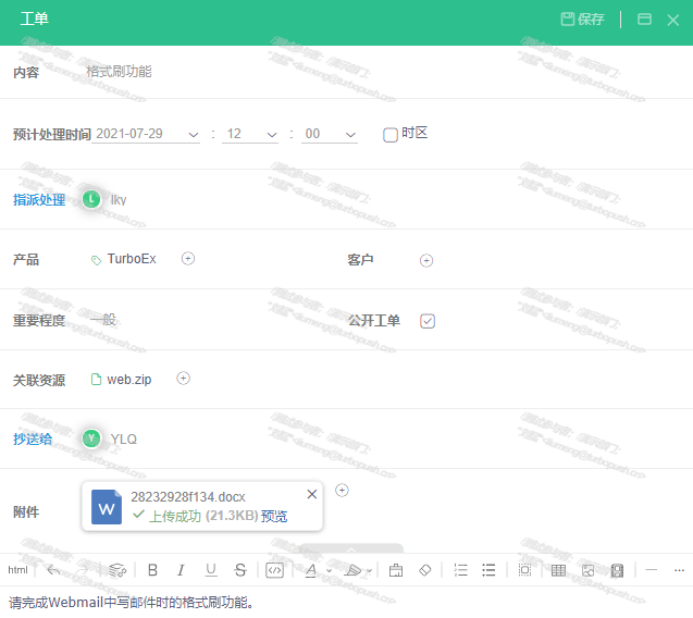 TurboEx郵件協(xié)同辦公平臺的工單管理系統(tǒng),為企業(yè)提供自動化任務(wù)流程管理功能,可廣泛應(yīng)用于工作事項指派、產(chǎn)品開發(fā)任務(wù)、企業(yè)IT支持服務(wù)、客戶支持任務(wù)、客戶售后服務(wù)等,用來創(chuàng)建、解決、跟蹤、匯總、統(tǒng)計企業(yè)內(nèi)部、用戶、客戶、合作伙伴等提交的事務(wù)請求,實現(xiàn)規(guī)范化、統(tǒng)一化和清晰化的任務(wù)管理。