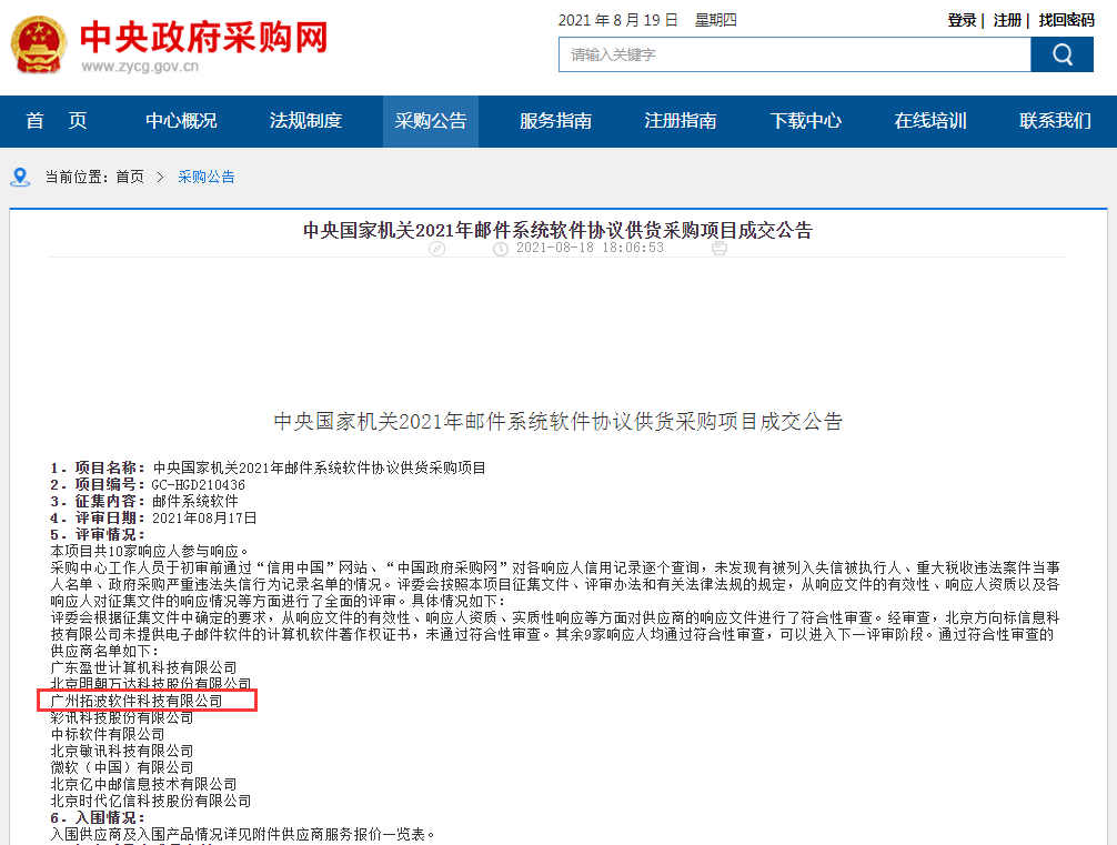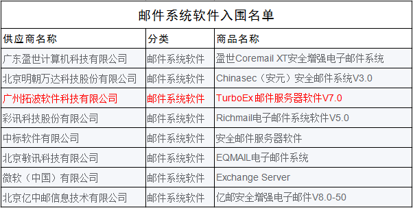 8月18日,中央國家機(jī)關(guān)政府采購中心(以下簡稱國采中心)就中央國家機(jī)關(guān)2021年郵件系統(tǒng)軟件協(xié)議供貨采購項(xiàng)目公布了《郵件系統(tǒng)軟件入圍名單》。國采中心評(píng)委會(huì)根據(jù)本項(xiàng)目征集文件、評(píng)審辦法和有關(guān)法律法規(guī)的規(guī)定,對(duì)各響應(yīng)人征集文件的響應(yīng)情況等方面進(jìn)行了全面的評(píng)審,廣州拓波軟件科技有限公司自主研發(fā)的“TurboEx郵件服務(wù)器軟件V7.0”產(chǎn)品再次成功入圍。