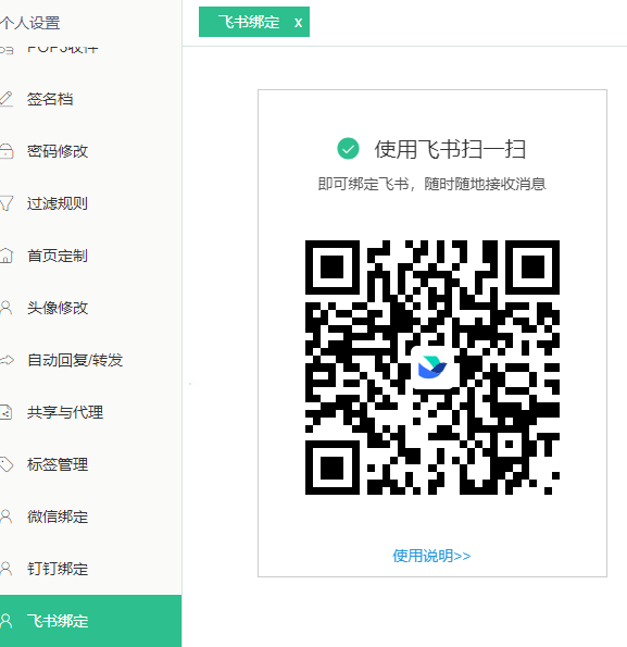 完成連接后,用戶則通過掃碼操作,即可馬上將自己的企業郵箱綁定飛書賬號,在飛書中使用TurboEx企業郵箱的各項功能。