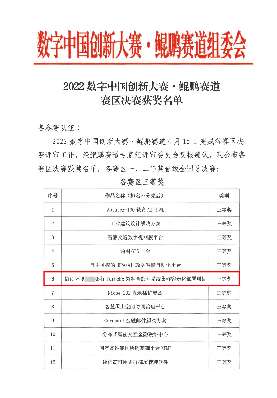 各展尖端科技,高手擂臺對決!2022數字中國創新大賽·鯤鵬賽道華南賽區決賽在4月15日落下帷幕。晉級決賽的賽隊在華南賽區決賽擂臺上再次展開緊張的對決,評審專家采用實操體驗與專家答辯“1+1式評審”的模式,拓波軟件的參賽作品“信創環境某某銀行TurboEx超融合郵件系統集群容器化部署項目”憑借其突出的高新技術:云原生、微服務、國產信創、安全可靠脫穎而出,榮獲2022數字中國創新大賽華南賽區三等獎。