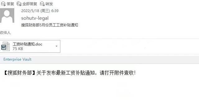 5月25日,搜狐全體員工遭遇工資補(bǔ)助詐騙沖上微博熱搜第一,搜狐全體員工在5月18日早晨收到一封來自“搜狐財務(wù)部”名為《5月份員工工資補(bǔ)助通知》的詐騙郵件,由于發(fā)件人的域名是正確的“sohutv-legal”,在郵件正文中再次標(biāo)注來自搜狐財務(wù)部,經(jīng)騙子偽裝,這看起來應(yīng)該是正常的內(nèi)部郵件,因此有搜狐員工點進(jìn)去,按照指示操作,填入了個人信息,結(jié)果銀行卡上的余額被劃走,損失逾4萬元。