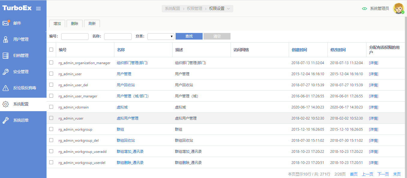 路徑:超級管理員運維后臺=》系統(tǒng)配置=》權(quán)限設(shè)置,在這里可以直接使用已經(jīng)內(nèi)置在TurboEx辦公郵件系統(tǒng)中的權(quán)限庫,如下: