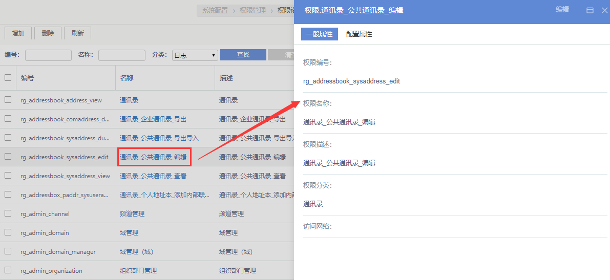 例如,我需要設(shè)立一個對用戶授權(quán)公共通訊錄的編輯權(quán)限的功能,點擊通訊錄_公共通訊錄_編輯來配置啟用。
