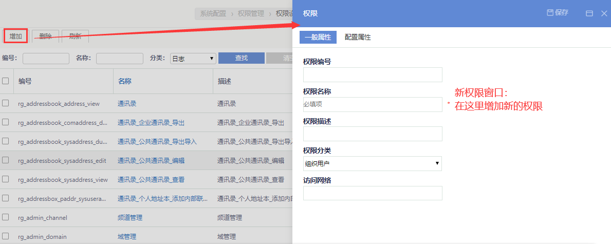 一般屬性這里填寫權(quán)限編號、名稱、描述、分類,訪問網(wǎng)絡(luò)是指配置權(quán)限生效的網(wǎng)絡(luò),實現(xiàn)了對不同網(wǎng)絡(luò)環(huán)境進(jìn)行不同的權(quán)限管理。