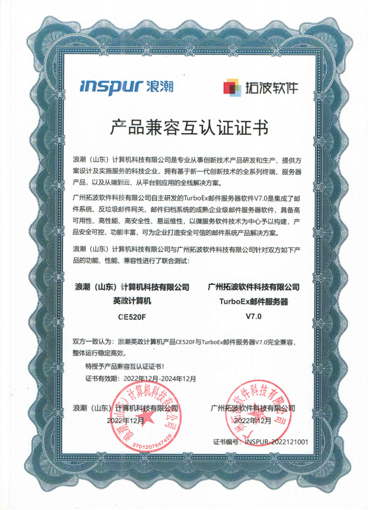 拓波軟件持續推進支持國產基礎軟硬件環境的信創軟件適配工作,協作客戶成功完成郵件系統信創國產化升級改造,日前已完成在浪潮英政計算機產品CE520F型號的兼容性互認證,完全兼容,相關的產品解決方案在客戶的信創郵件系統改造項目成功應用。