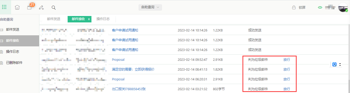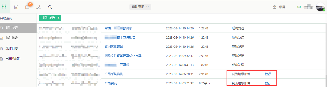 2,查看我的賬戶里所有發出的郵件記錄,包括被系統判斷為垃圾廣告郵件而停止發送的郵件,如果不是垃圾廣告郵件,可點擊“放行”,執行郵件發送。