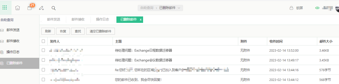 用戶執行刪除后的郵件,TurboEx郵件系統默認還為用戶自動在后臺保存48小時(此時間可有郵件系統運維工程師在后臺配置和修改)。每個用戶都可以在“自助查詢”的“已刪除郵件”里查詢過去48小時內的刪除郵件,如果是誤刪的,可以點擊執行“恢復”。