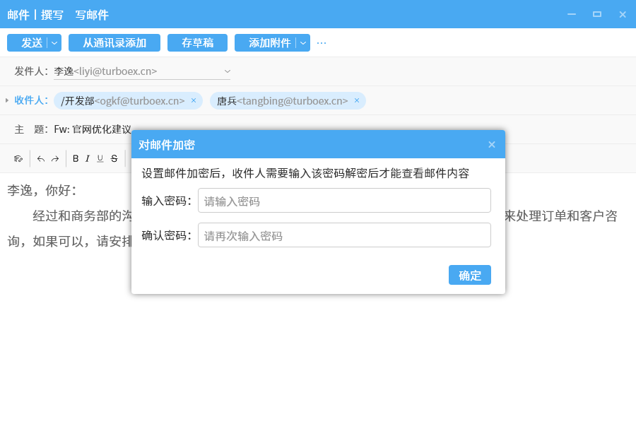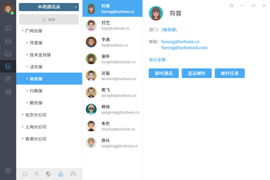 TurboEx郵件客戶端的通訊錄同步查詢和管理企業通訊錄、公共通訊錄、群組通訊錄、個人通訊錄,可直接對部門、群組群發郵件,一鍵點擊聯系人查看與他的全部來往郵件,或者直接和他展開IM聊天。