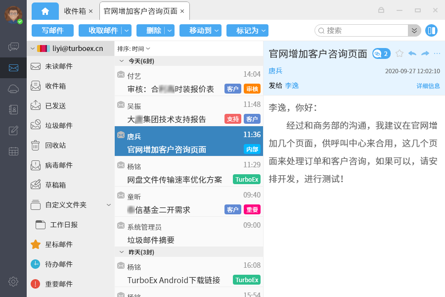 TurboEx郵件客戶端分為電腦桌面客戶端和手機郵箱APP,桌面客戶端支持Windows/Linux/iOS操作系統,手機APP支持安卓/蘋果手機,提供平板電腦自適應Webmail。