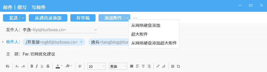 為了防止因郵件太大導致發送失敗,使用超大附件功能,先將大文件上傳至網絡云盤,再分享鏈接,而不是直接將文件作為郵件附件進行發送。可提高電子郵件的發送速度,并節省收發雙方的郵箱占用空間。