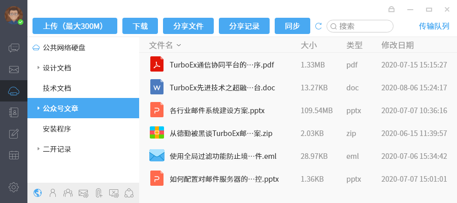 TurboEx的網絡硬盤功能區統一存放公共網絡硬盤、個人網絡硬盤、IM收發文件、郵件附件超大附件、共享文件,提供下載、上傳、分享等功能,系統管理員在運維后臺分配給用戶的使用授權。