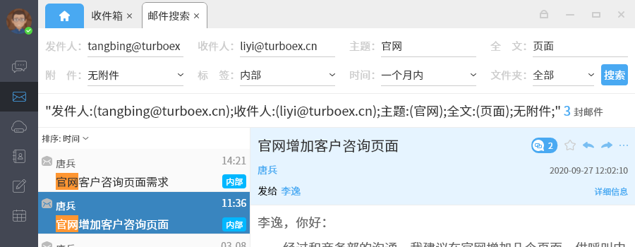 TurboEx郵件客戶端的搜索工具包括:郵件搜索、IM消息搜索、文件搜索、筆記搜索。郵件搜索工具提供收件人、發件人、主題、全文、附件、標簽、時間、文件夾等條件進行搜索。