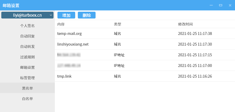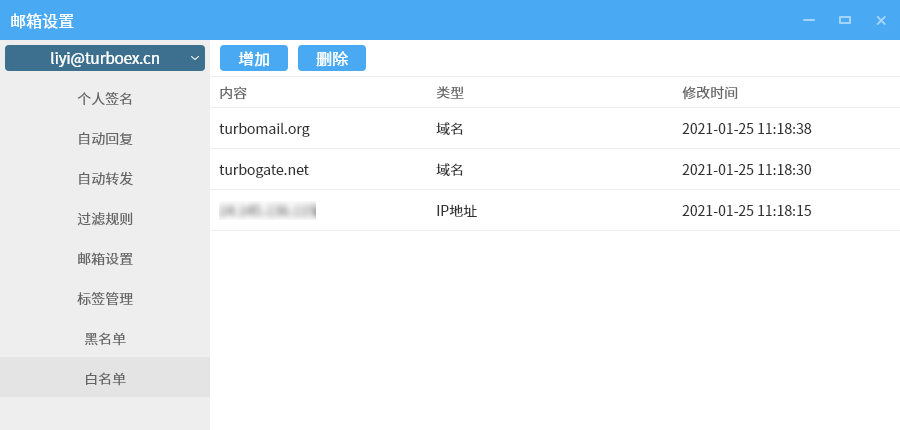 添加黑名單和白名單,黑名單為拒收的郵件地址,白名單為放行的郵件地址。