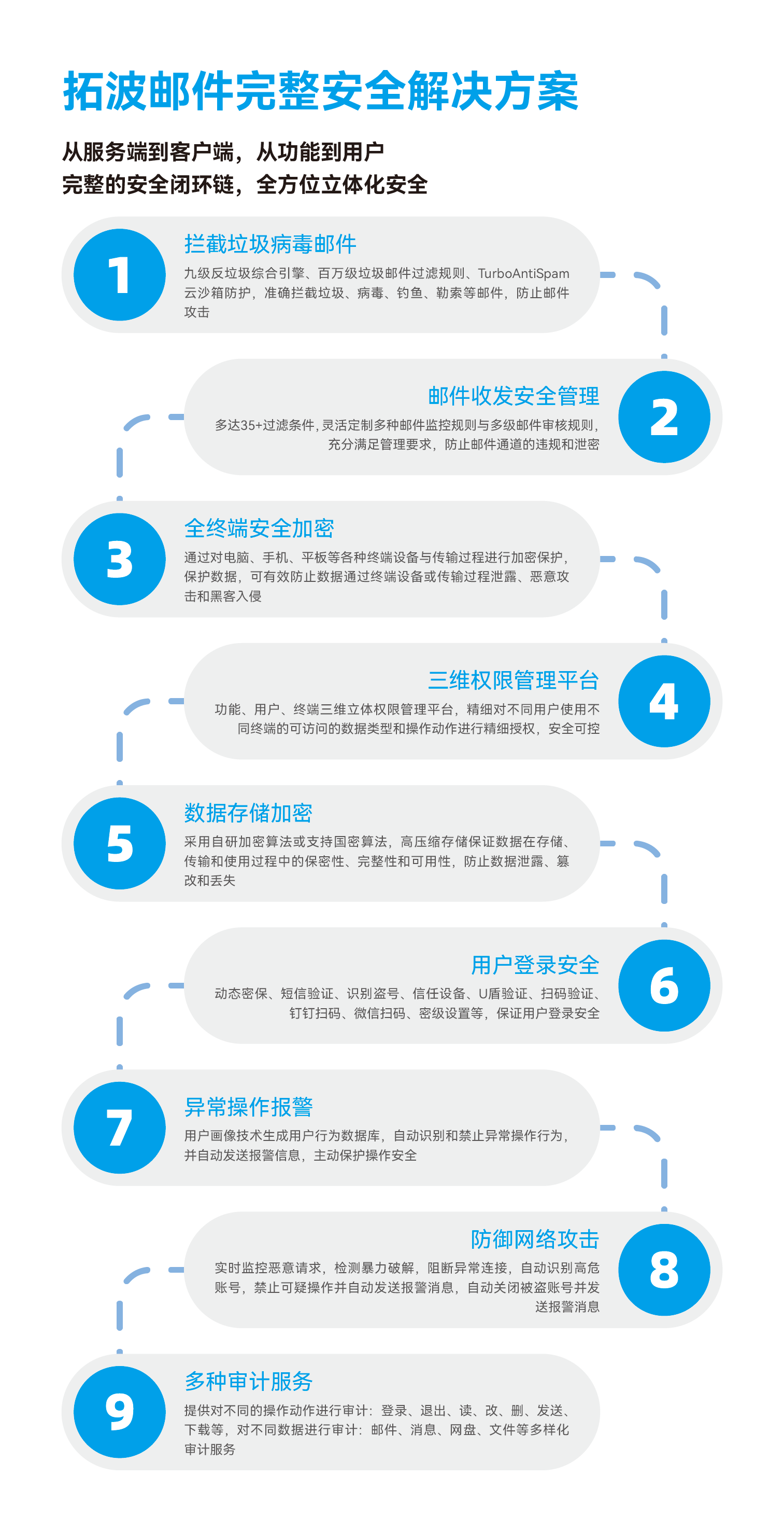 拓波軟件作為信創(chuàng)安全電子郵件產(chǎn)品領(lǐng)域的頂尖廠商,自主研發(fā)的安全辦公郵件系統(tǒng)、反垃圾郵件網(wǎng)關(guān)、郵件數(shù)據(jù)防泄漏系統(tǒng)、郵件安全審計(jì)系統(tǒng)、郵件數(shù)據(jù)歸檔網(wǎng)關(guān)等產(chǎn)品,充分滿足了在各種網(wǎng)絡(luò)環(huán)境與應(yīng)用場(chǎng)景下郵件數(shù)據(jù)、用戶數(shù)據(jù)、系統(tǒng)數(shù)據(jù)的安全高速運(yùn)轉(zhuǎn),并提供多種多樣的監(jiān)控、審計(jì)、統(tǒng)計(jì)服務(wù)滿足各類管理要求。拓波郵件華東地區(qū)金融、企業(yè)、政務(wù)等行業(yè)擁有眾多的客戶群體,為華東客戶提供優(yōu)質(zhì)產(chǎn)品與服務(wù),協(xié)力構(gòu)建安全可控、高效溝通與靈敏協(xié)作的辦公郵件軟件平臺(tái)。