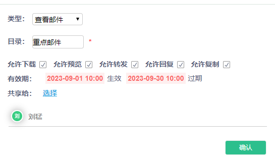 可以指定將您的某個郵件文件夾共享給同事查看,制定共享的權限:下載、轉發、回復,配置共享的時間。