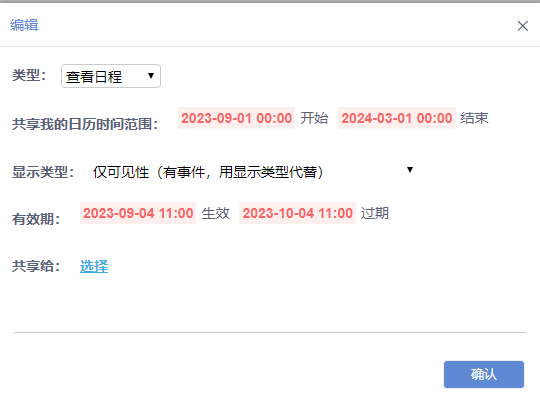 對于個人日程,可分開配置查看日程的共享和編輯日程的共享。日程編輯共享授權后,您的助手或者秘書可以全權代理新建和修改您的日程。