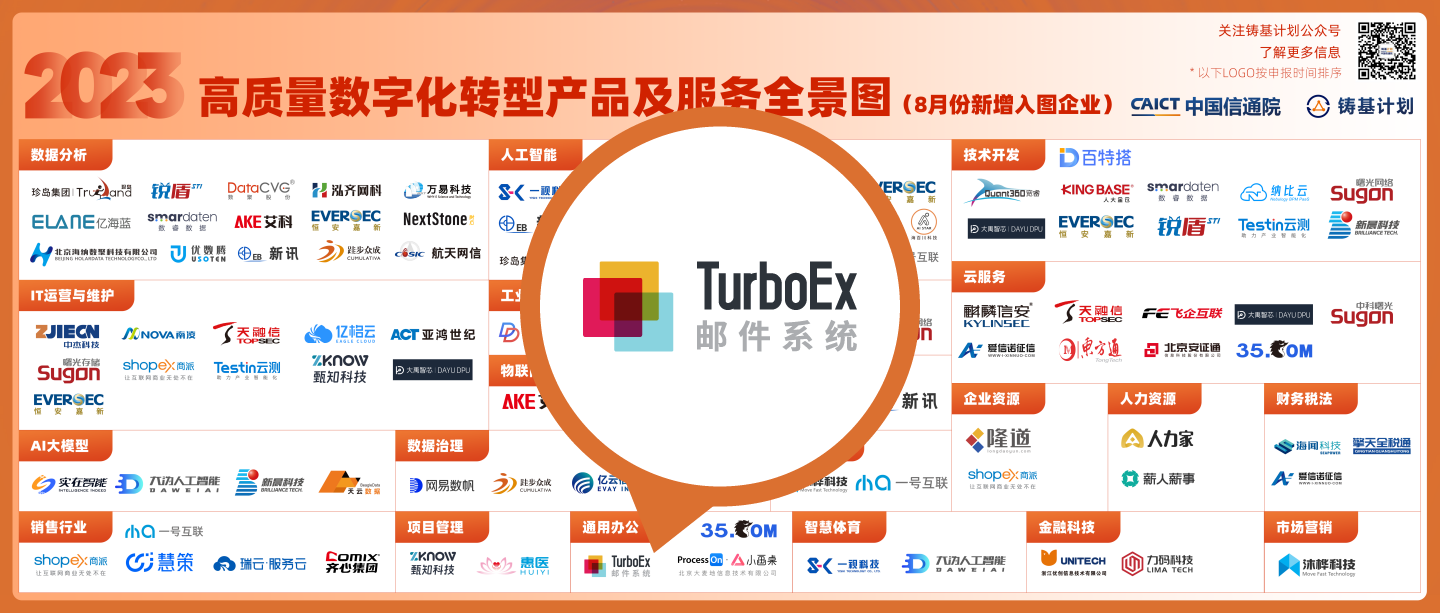 拓波軟件作為中國頭部電子郵件系統產品研發商,旗下的TurboEx大型辦公郵件系統創新實現了國產郵件系統從簡單單一電子郵件產品向企業應用級郵件系統的升級跨代,于近期成功入選2023年中國信通院“鑄基計劃高質量數字化轉型產品及服務全景圖”!
