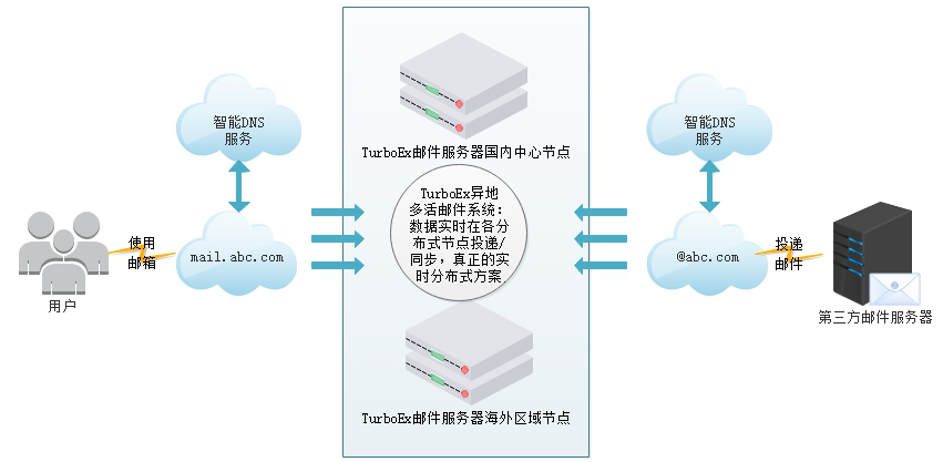 TurboEx分布式郵件系統通過在分布式系統架構與存儲設計技術的先進設計,各郵件服務器間的數據是在TurboEx分布式郵件系統內實時同步投遞(更新)的,而不再是定時同步很大的數據包,因此大大降低了對異地網絡速度的要求,從而徹底完善了異地分布式郵件系統的性能,并且使運維工作變得輕松和簡易。