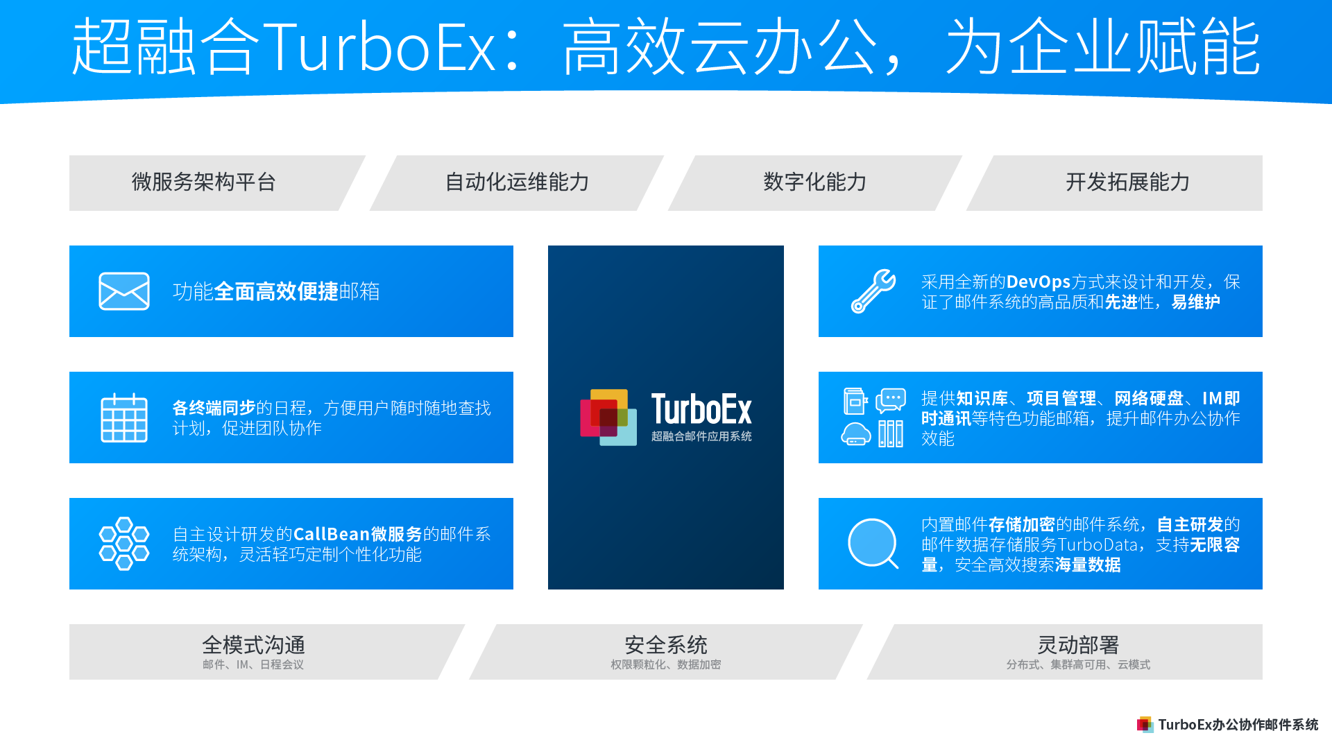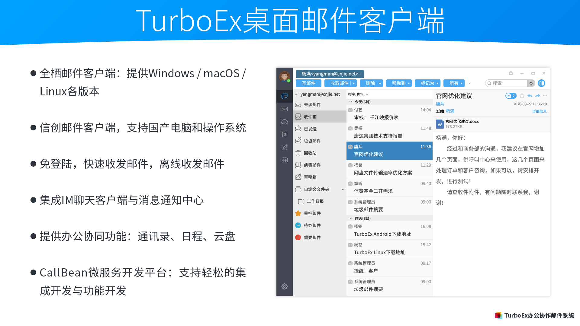 先進的國產TurboEx辦公應用郵件服務器軟件采用先進的CallBean微服務軟件、DevOps開發性運維、容器化等先進技術,支持云原生技術體系,是我國融合電子郵件、IM即時通訊、文件共享、日程協作、在線會議、工作流、項目任務管理等辦公套件的超融合郵件協同辦公平臺。TurboEx為中國信創軟件,全面支持市場上主流的信創基礎軟硬件,對標微軟Office365,可完全替換美國微軟Exchange。支持私有化企業部署運維,支持各類型混合云部署模式,提供Web、PC客戶端、移動辦公APP等應用,適合企業日常溝通協作的所有需求。