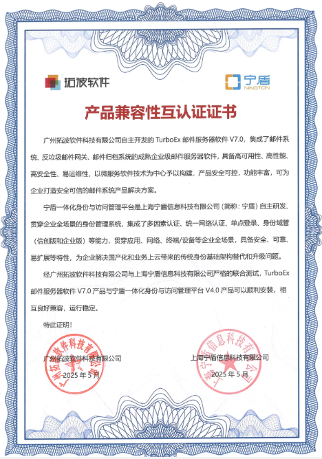 在國產(chǎn)信創(chuàng)產(chǎn)業(yè)高速發(fā)展的背景下,產(chǎn)品生態(tài)的兼容性已成為衡量信創(chuàng)解決方案實(shí)用性的關(guān)鍵指標(biāo)。近日,拓波軟件與寧盾科技達(dá)成重要合作,雙方共同宣布寧盾身份域管(信創(chuàng)版)與TurboEx郵件系統(tǒng)順利完成兼容性互認(rèn)證。經(jīng)過嚴(yán)格測(cè)試,兩款產(chǎn)品在集成應(yīng)用、功能適配、系統(tǒng)穩(wěn)定性等方面均表現(xiàn)出色,可為企業(yè)用戶提供基于安全可靠的寧盾一體化身份管理體系下的TurboEx信創(chuàng)郵件系統(tǒng)平臺(tái)解決方案。