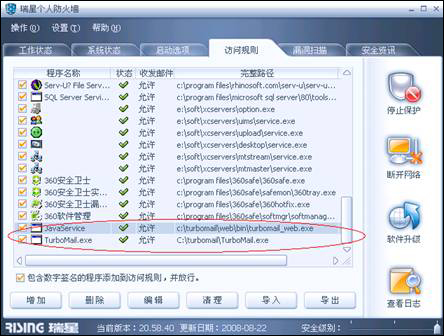 瑞星殺毒軟件和防火墻默認會阻止郵件服務(wù)器和Webmail 服務(wù)的運行,可按一些步驟進行設(shè)置,使得郵件服務(wù)器正常運行