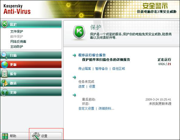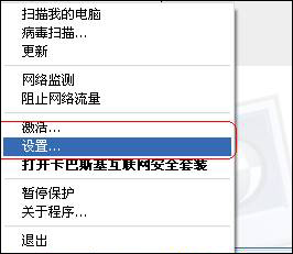 - 打開卡巴界面,點擊設(shè)置 ,如下圖進放設(shè)置界面