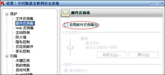 - 關(guān)閉卡巴的郵件反病毒功能,這樣您的TurboMail郵件服務(wù)器才能正常啟動。