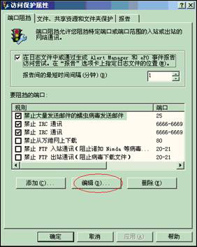 - 選擇“禁止大量發(fā)送郵件的蠕蟲病毒發(fā)送郵件”,點“編輯”,進入“添加或編輯端口阻擋范圍”界面。