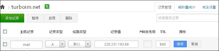 - 小提示:不要忘記“mail.turboim.net.”的最后一點,它表示域名記錄值到.net為止。