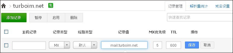 - 主機記錄為空,記錄類型為MX,記錄值為剛才添加的A記錄“mail.turboim.net.”,保存