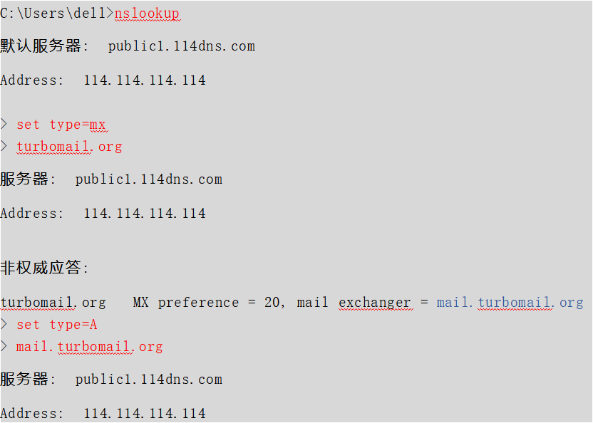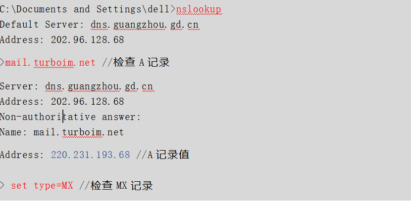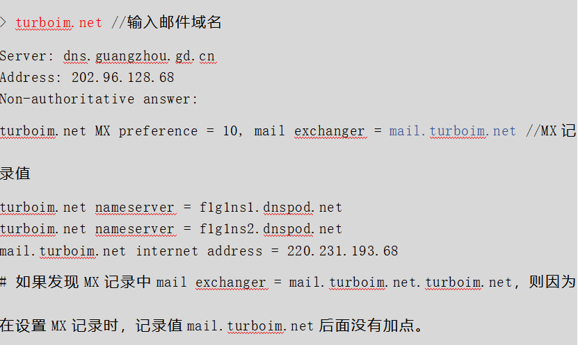 - 至此 ,郵件域名解析設置完畢。可以在命令行下通過以下命令檢查域名解析是否生效和正確