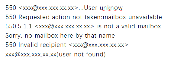 2.提示信息:invalid address (#5.5.0)或者 User unknown 或者 user is not found