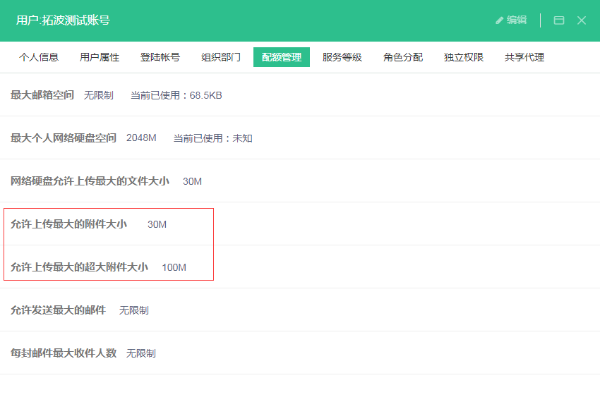 - 登錄postmaster管理員賬號》用戶管理》點擊“用戶”》點擊“編輯”》點擊“配額管理”,設置允許個人用戶附件上傳大小