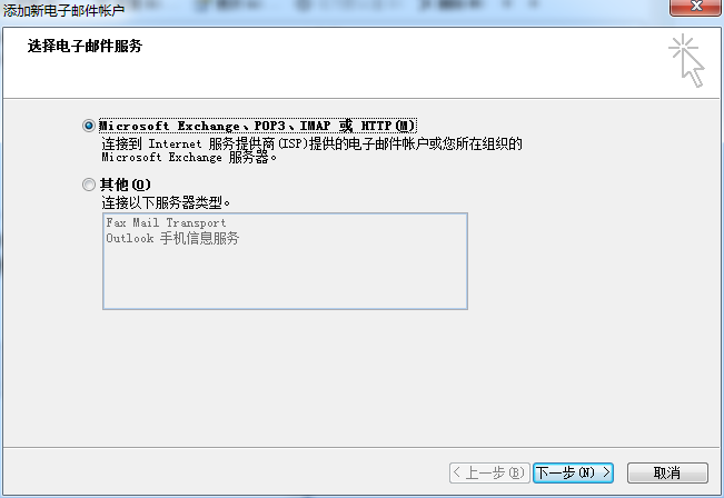 - 選擇”Microsoft Exchang、pop3、imap或HTTP”,點擊“下一步”