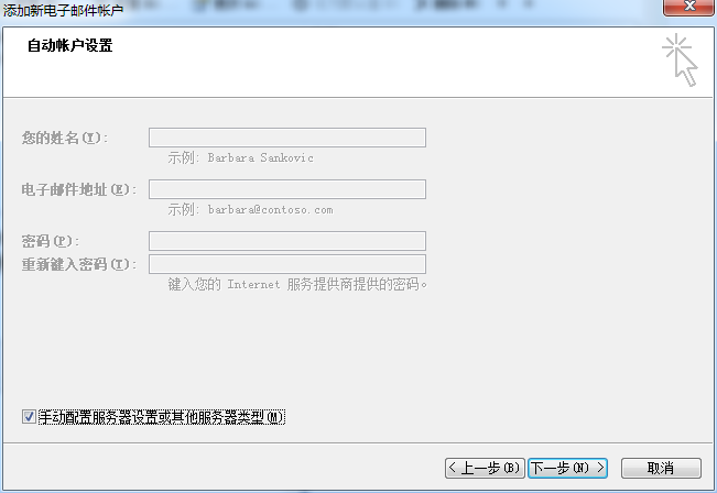 - 自動配置賬號設置,勾選“手動配置服務器設置和其他服務器類型”,點擊“下一步”