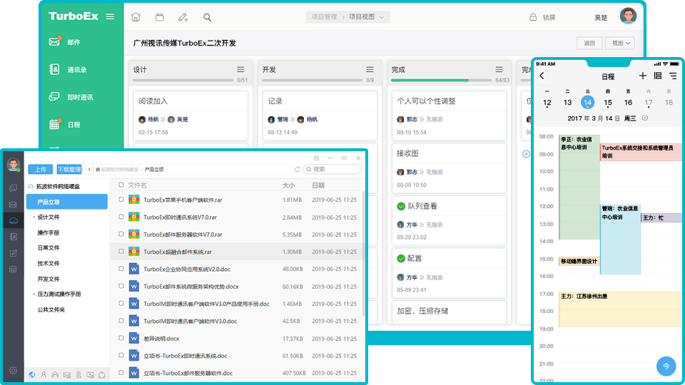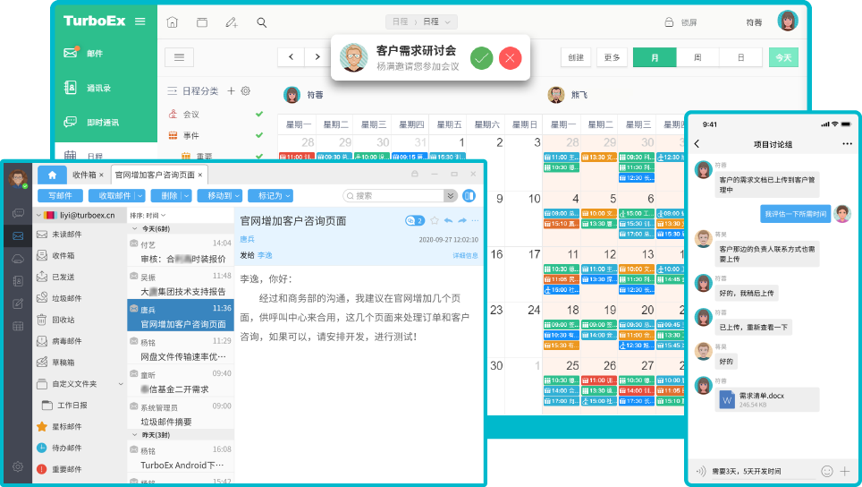 TurboEx提供支持各種操作系統(麒麟/UOS/Windows/macOS/Linux)的電腦桌面客戶端和覆蓋全終端(鴻蒙/安卓/蘋果)的手機APP軟件,客戶端軟件不僅包含企業郵箱,包括了所有的TurboEx平臺的功能模塊(IM/會議/文件/項目/日程等),無論在何時何地,用戶可迅速進入工作角色,進行移動辦公。