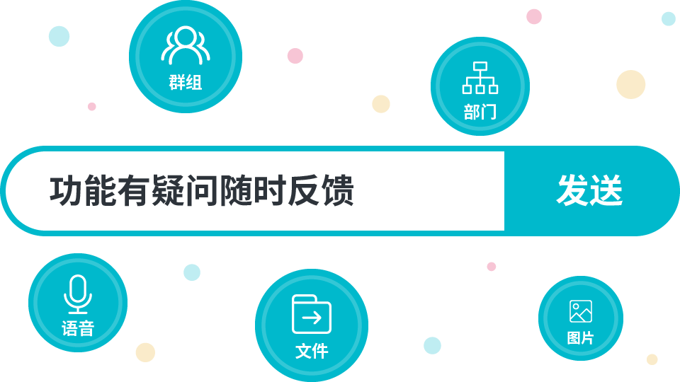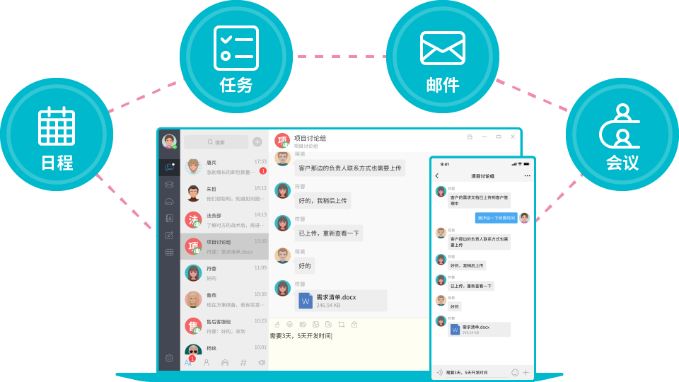單獨密聊、多人聊天、部門溝通組、項目溝通組、文件收發,截屏、發送圖片、音視頻聊天等消息類型;直接在聊天窗口發送筆記、網盤、公告、日程、會議、知識庫;直接在會議、網盤文件、知識庫、項目任務中展開在線IM溝通。通過在各種辦公軟件中嵌入IM聊天功能,滿足在各種工作場景時的在線溝通要求,讓溝通順滑無處不在。